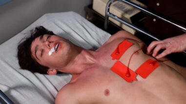 Dr Smith then attaches electrodes to his chest and starts shocking him. Starting with a lower voltage and slowly increasing over time. He writhes and struggles in pain, views from all angles and his oiled body wriggles and twitches. Eventually he starts foaming at the mouth before his eyes roll back for a final time.